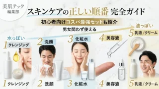 「化粧水と乳液、どっちが先?」と迷うスキンケア初心者へ。1,000人の肌悩みに向き合った編集部が、正しい順番(水から油へ)と本当に効く成分を徹底解説。月1,000円で始められる男女別おすすめコスパ最強セットも紹介します。